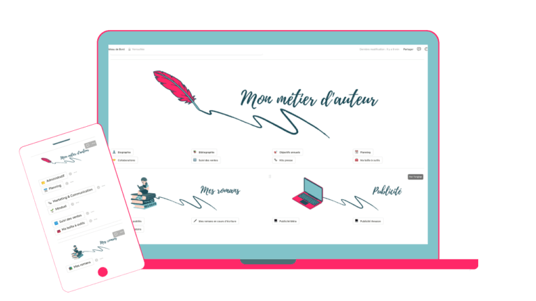 Illustration de l'espace de travail ScriptoSpotlight sur Notion spécialement conçu pour les écrivains en auto-édition. Esquiss'Plume. templates notion auteurs